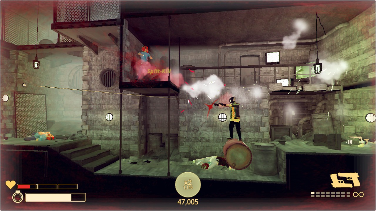 The real star here is the gameplay. You’ll flip, spin, roll, and wall-jump through levels while dual-wielding pistols and other weapons that can target enemies independently. The combat feels like a choreographed action sequence, you can kick frying pans mid-air to ricochet bullets, slow time to dodge incoming fire, and chain kills together for satisfying combos. These mechanics transform simple side-scrolling shooting into something genuinely addictive.